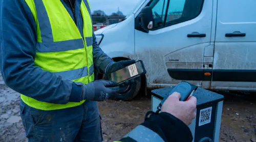 Think of this as the future site setup: an electrician scanning a QR‑tagged temporary charger in a rugged compound, with WhatsApp alerts and job‑costing on a tablet tying the hardware directly into your digital workflow.