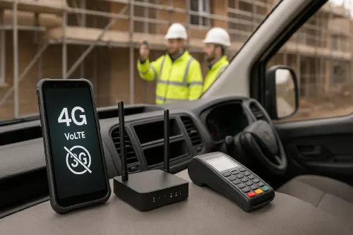 Trades van cab with 4G VoLTE phone, 4G router and card terminal showing the 3G switch off context