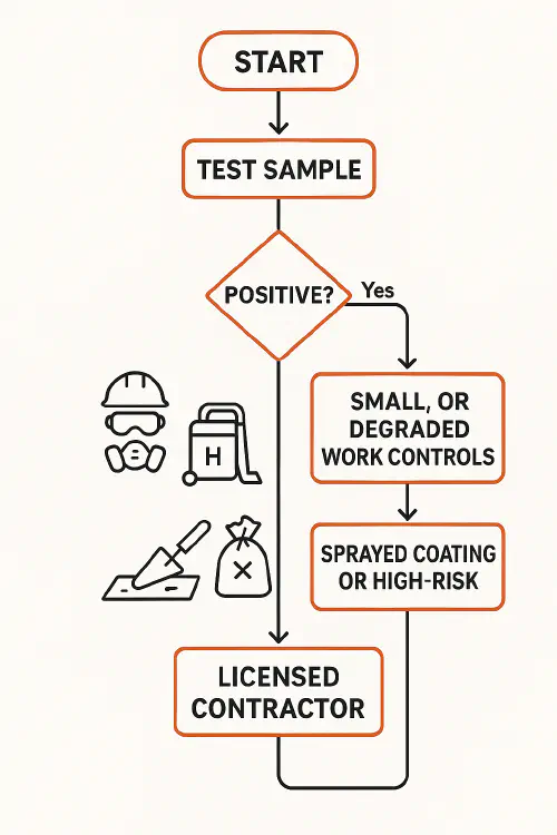 - Start with a sample test. If positive and the task is small and controlled, it is usually non-licensed. Use wet methods and H-class extraction.