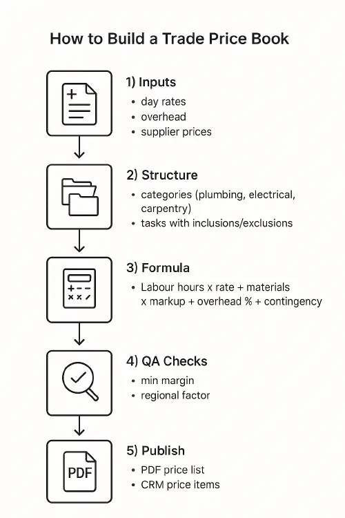 A trade price book is a list of standard jobs with clear inclusions/exclusions and a simple formula:
