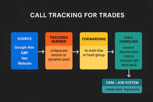 - Prefer a local 01/02 tracking number that matches your service area. It improves trust and click‑to‑call rates.