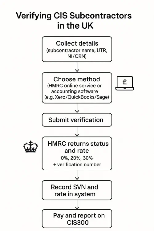 - Verify every new subcontractor before first payment, and reverify if you have not paid them in the current or previous two tax years. HMRC returns a CIS rate and a verification number. If you cannot verify, you must deduct at 30 percent until HMRC says otherwise.
