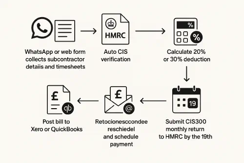 Flow diagram showing CIS automation from subcontractor intake to HMRC CIS300 return in the UK