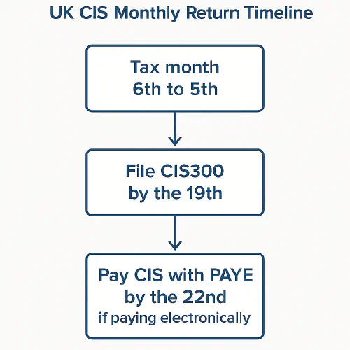 - Pay the CIS deductions to HMRC with your PAYE by the 22nd if paying electronically.