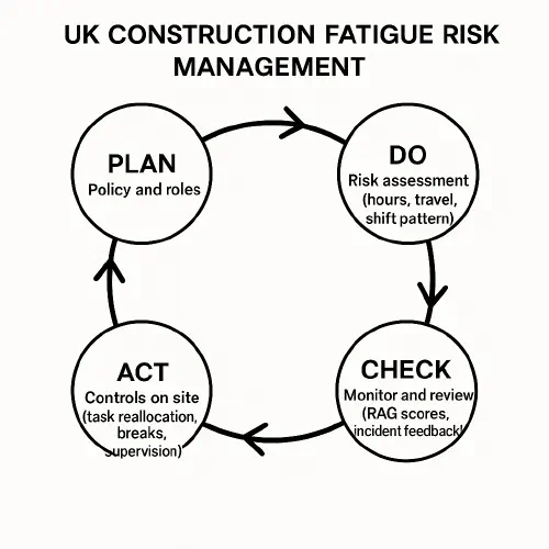 If you are running safety critical work, nights, long travel times or complex rosters, a formal FRMS helps you demonstrate control. The Office of Rail and Road guidance is a practical blueprint that aligns with HSE’s Plan Do Check Act cycle: How to use this guidance and Fatigue Risk Management Systems. The principles transfer well to construction.