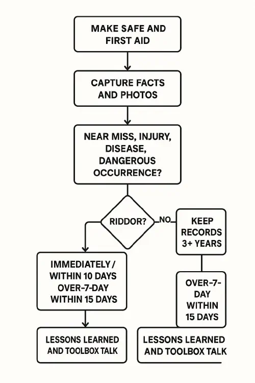 - RIDDOR check using the HSE pages above. If reportable, submit online and record the reference number.