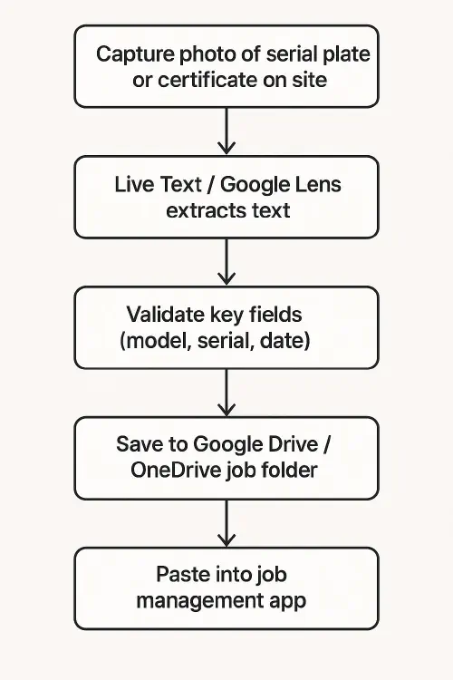 - Boiler or heat pump commissioning: photo the data plate, OCR the model/serial, paste into commissioning sheet and MCS pack.