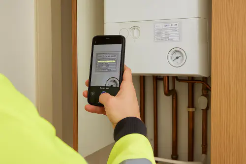 Engineer using a phone to OCR a boiler serial plate with Live Text/Google Lens