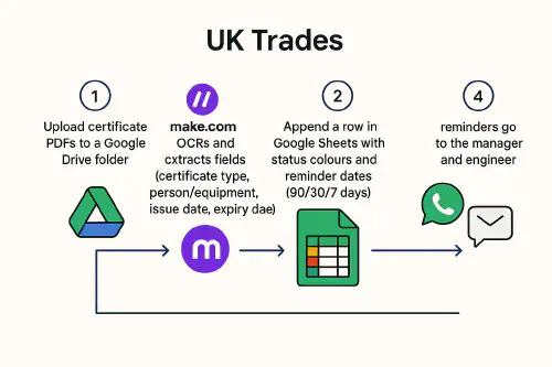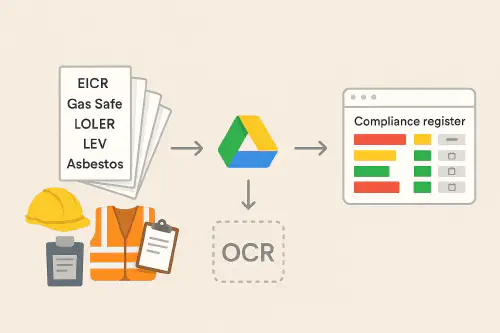 You can drop certificate PDFs (EICR, Gas Safe, LOLER, LEV, asbestos, first aid and more) into a Google Drive folder and have key fields written into a Google Sheet automatically, with colour statuses and reminder emails at 90, 30 and 7 days before expiry. Start with a simple Sheet plus a short Apps Script for email reminders, then, if you want full automation from PDFs, connect Drive to Make.com for OCR and field extraction. No coding background needed.