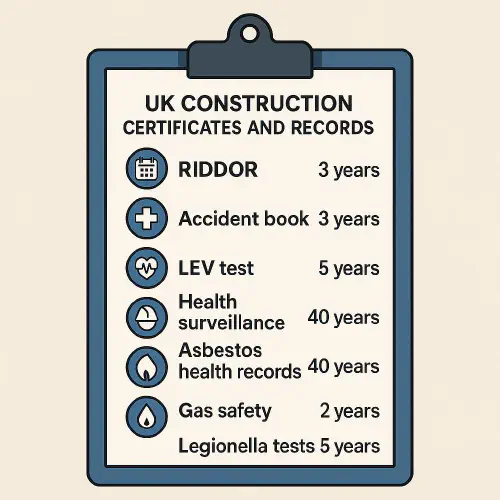 For links to official pages summarising these periods, see: Health surveillance record keeping (HSE), Asbestos NNLW guidance (HSE), LEV FAQs (HSE), Gas safety record guidance (HSE), Legionella records (HSE), RIDDOR Reg 12 (legislation.gov.uk).