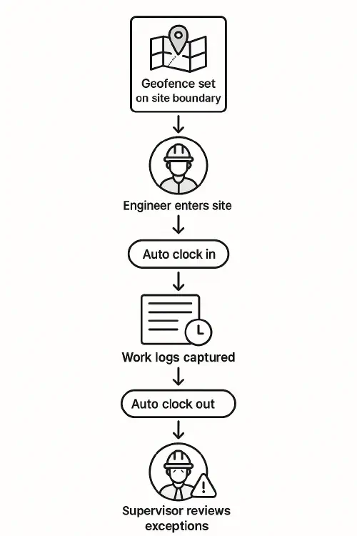 If your team still signs a paper sheet or texts start times, you are likely losing hours every week. Geofencing timesheets use a virtual boundary around your site so clock in starts automatically when an engineer arrives and stops when they leave. Set it up once and it runs in the background.