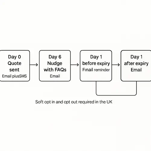 The cadence in this guide uses four to five touchpoints across email, SMS and WhatsApp. If you still get no response, park the quote and send a short check in after 30 days.