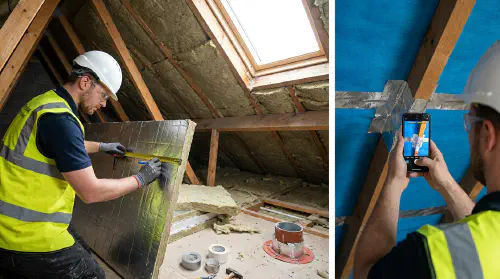 - Name photos by location and stage (for example: “Loft - South roof slope - insulation fitted - before board”)