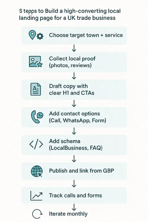 Local landing pages are town or postcode pages on your site like “Plumber in Leeds” or “Electrician in Croydon.” When done right they pair with your Google Business Profile to win more map and website clicks. Build one page per priority town with: