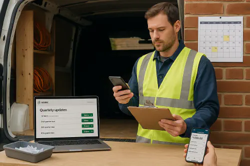 Tradesperson at van desk organising receipts with MTD quarterly deadlines on a laptop screen