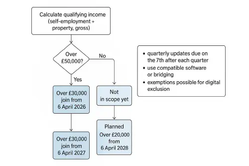 - If your combined gross income from self‑employment and/or property is over £50,000, you will need to use MTD for Income Tax from 6 April 2026. Over £30,000 joins from 6 April 2027. Government has stated an intention to bring in over £20,000 from April 2028. See the latest from GOV.UK.