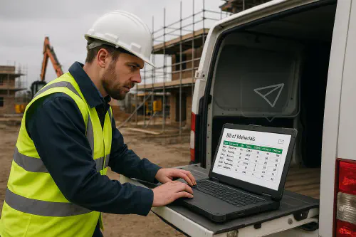 Foreman using a laptop with a Google Sheets style Bill of Materials and auto email overlay