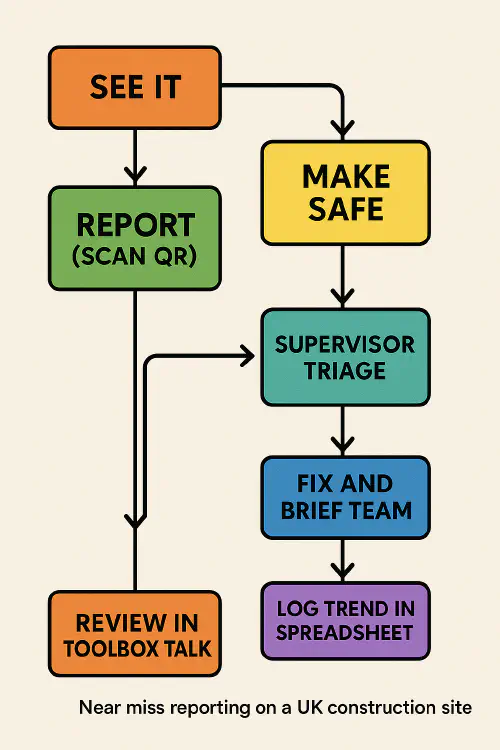 Near miss reporting flow: See it → Make safe → Report (QR) → Supervisor triage → Fix and brief → Log trend → Toolbox talk review