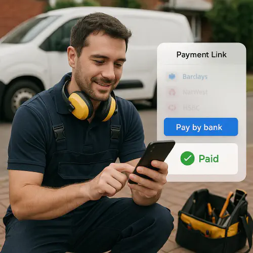 What about variable recurring payments (VRP)? VRP is growing in the UK. For now, most trades will use one-off pay-by-bank links for deposits/balances; keep Direct Debit for true recurring.