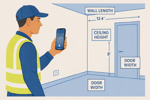 - Flag any tricky surfaces (mirrors, glass, black shiny units) and measure them manually.