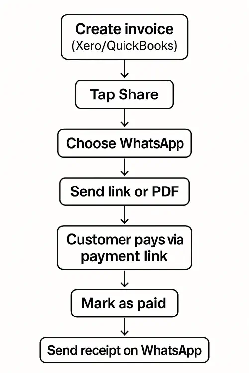 - Xero: Open the invoice in the Xero Accounting app, tap the menu, choose Share, then send via WhatsApp. The customer gets the invoice link; you can share PDFs if you export them first.