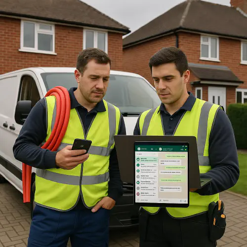 - Job handover: assign the chat to the engineer on the day, share arrival window, and pin key details.