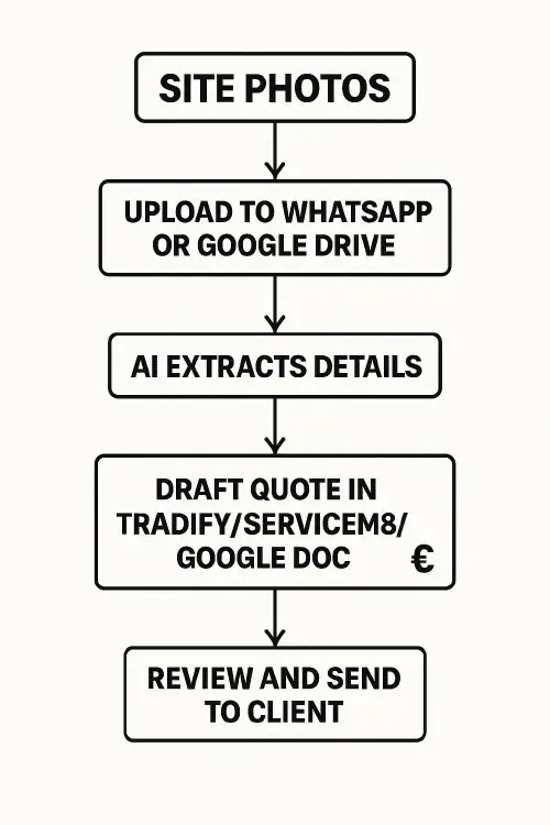 Flowchart: Photos to WhatsApp or Drive, AI extracts details, draft quote to Tradify/ServiceM8/Docs, review and send