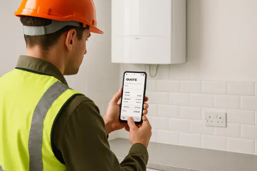 Engineer taking site photos that generate an AI draft quote with labour, materials and totals