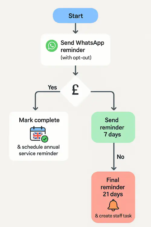 - Reminders go by WhatsApp (or SMS/email) with a link to the manufacturer’s registration form (e.g., Vaillant, Ideal, Worcester Bosch).