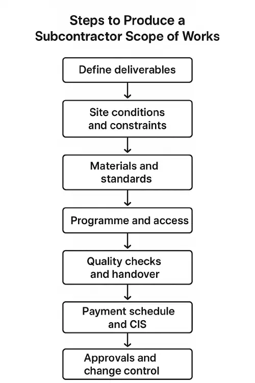 A subcontractor Scope of Works should be short and specific. It must list deliverables, standards, materials, programme, access rules, quality checks, payment stages and what is excluded. Include a CIS-ready payment schedule and a simple change-control note so extra works get authorised before doing them. Keep it to two to four pages. Use the template below and attach drawings and specs.