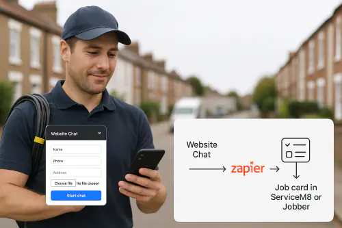 UK tradesperson using a website live chat to capture address and photos, flowing into Zapier and a job card