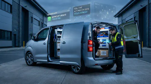 A kitted out trades van under studio lighting showing labelled shelves and digital overlays, capturing the reality of modern field teams that run van stock and alerts from their phones