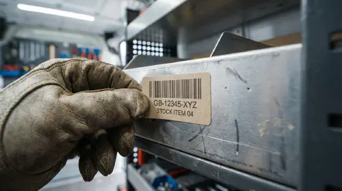 Use one label per SKU location on the van shelf. When an engineer takes stock, they scan the shelf, type the new quantity and move on. No trying to remember catalogue numbers, no tiny handwriting.