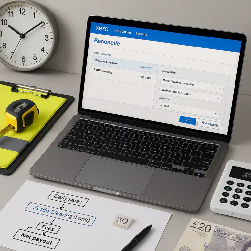 UK trades desk with Xero bank reconciliation and a simple Zettle clearing flow diagram